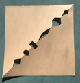 Doblegueu el quadrat per la diagonal i retalleu figures com ara les que hi ha a la imatge. Una vegada feta tota la diagonal desdobleu el paper.